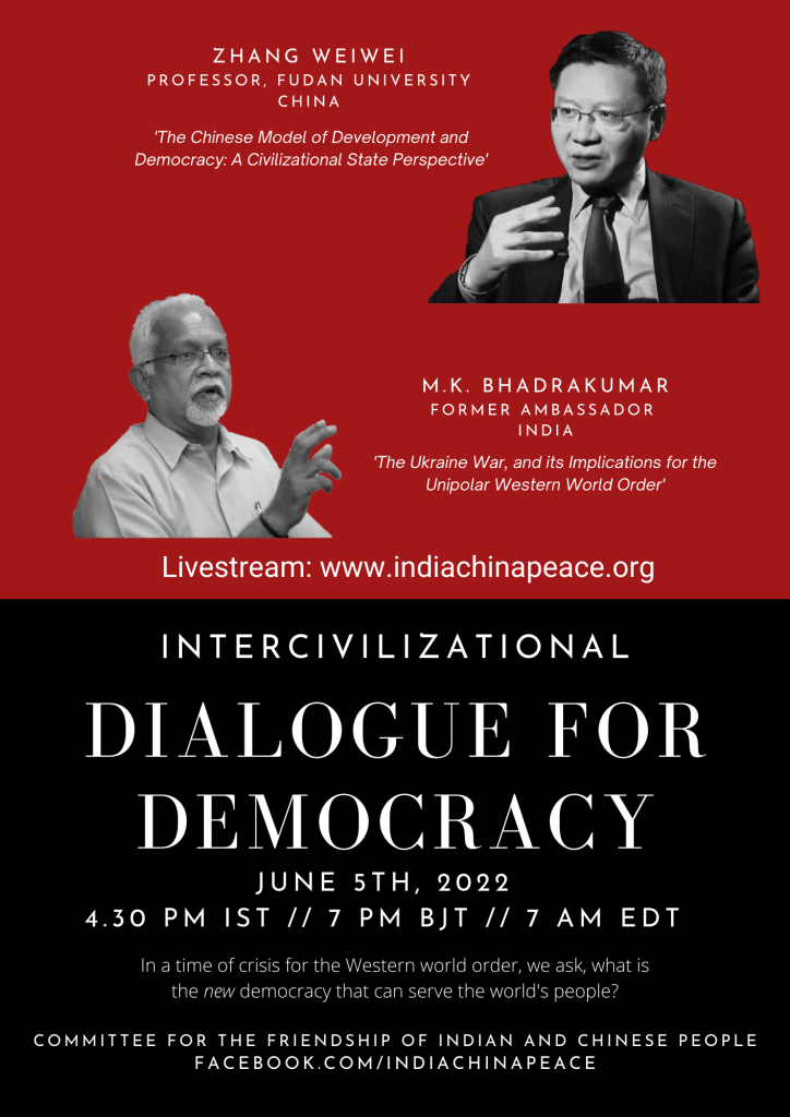 A new era is being born, and Africa and Asia are poised now to play a central role in the shaping of the world order. This is bolstered by the rise of China on the world stage. The shaping of this new world order will necessarily involve intercivilizational dialogue. The modern civilizations of the world need to cooperate economically and politically to set up a new world system, and for this they need to understand each other unmediated by the West. This requires a return to the legacy of Afro-Asian solidarity and the Bandung movement. A step towards this took the form of an Intercivilizational Dialogue for Democracy on the 5th of June, 2022 between Chinese scholar Zhang Weiwei and Indian ex-ambassador M.K. Bhadrakumar. The conversation referred to democracy in its broadest conception, not only within nations, but also in the international political and economic world order.